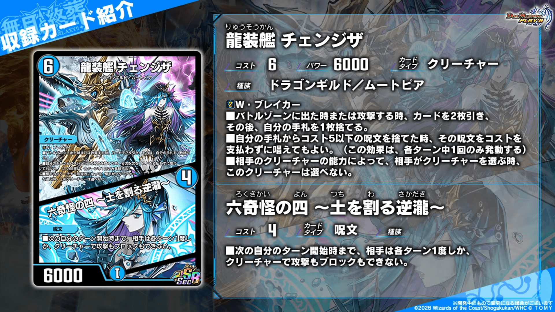 レアリティ:SRカードタイプ:クリーチャー/呪文コスト:6/4パワー:6000/-文明:水種族:ドラゴン・ギルドムートピア-効果テキスト|画像拡大 |