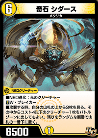 | ■NEO進化:光のクリーチャー ■W・ブレイカー ■攻撃する時、自分の山札の上から3枚を見る。その中からコスト4以下のクリーチャー1枚をバトルゾーンに出してもよい。残りをランダムな順番で山札の一番下に置く。 |