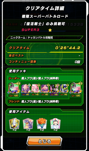 問題は変身までの4ターンを稼ぐ方法だが、ゴルフリ・痩せブウで被ダメージを減らし、受けたダメージはセルの体力回復で仕切り直そう。サポートアイテムの使い所は壁役以外が複数回殴られる場面で使おう。