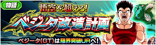 物語イベント「悟空を超えろ!ベジータ改造計画」は、イベント産キャラ【限界を超える挑戦】ベジータ(GT)(大猿)を入手するためのイベントだ。ドロップ入手できる【最終決戦のプラン】ベジータ(GT)を育成して、ベジータの完成を目指していこう!