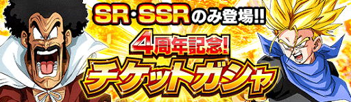 4周年記念チケットで回すことができる嬉しいガチャ。龍石を使うことなくガチャができ、最新のLRキャラトランクス&マイまですべてのLRキャラが排出される可能性がある。確率は非常に低いが、LRを手に入れるチャンスだぞ!