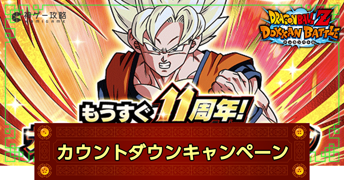 ドッカンバトル(ドカバト)の「11周年カウントダウンキャンペーン」の開催イベントやガチャ情報を掲載。極限Zバトル「聖龍祭悟空」やセレクト龍石11などのイベント開催日時を掲載しているため、キャンペーンの情報を知りたい人は参考にどうぞ。