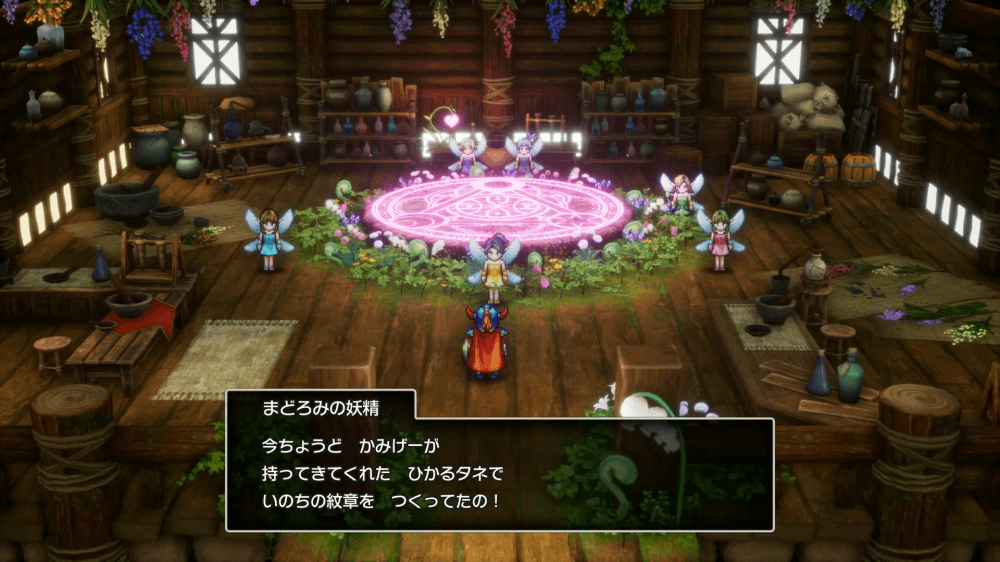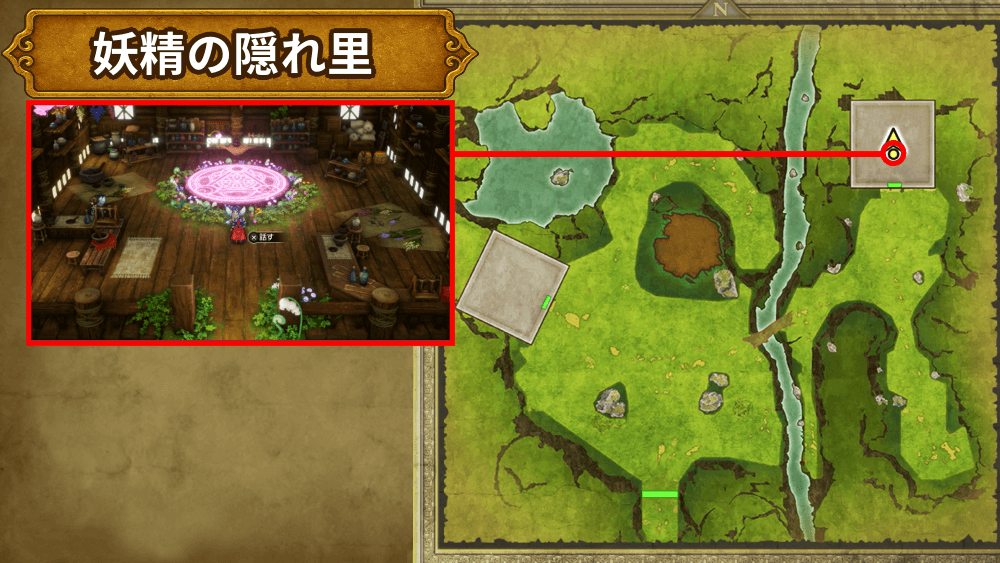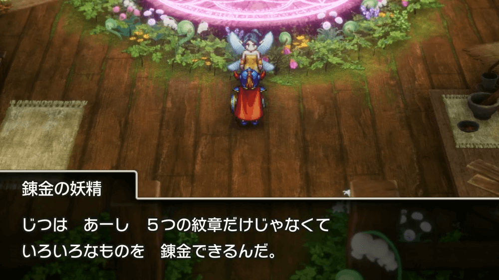 妖精錬金は、妖精の隠れ里右上にある家屋の中で、錬金妖精に話しかけると行える。紋章錬金は必要素材を入手したタイミングで自動的に行われ、アイテム錬金はルビス復活後に錬金したいアイテムを選ぶと実行可能だ。