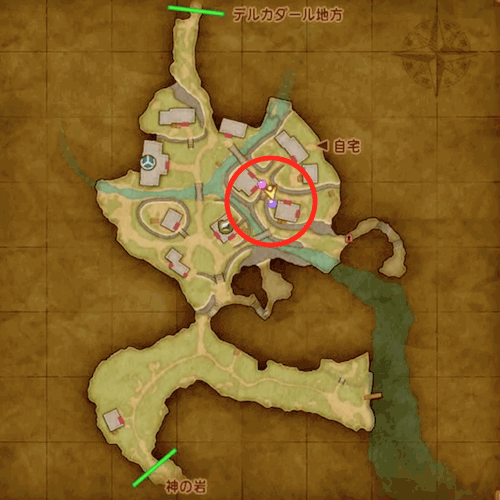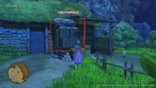 屋根の上のキラキラから「かぜきりのはね」を入手。 ※3DSの場合は、南西にある馬小屋付近の宝箱から入手 |