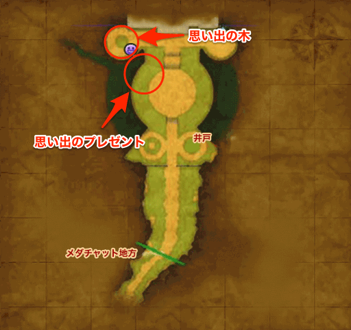 メダル女学園校舎前の花壇にあるキラキラを調べると、「思い出のプレゼント」を入手できる。3DS版の場合は、思い出の木から東に20マス、南に5マスの場所で入手可能。2Dモードにすると分かりやすい |
