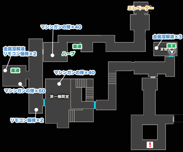 | 2 | 突き当たりの部屋の蛇腹の扉を開き「金属溶解液×3」を入手する |