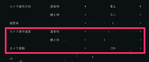 カメラ酔い防止には「カメラ操作速度」を遅くし(−に近づける)「カメラ振動」をOFFに設定しよう。