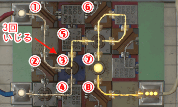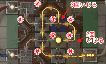 通電させるためには、③を3回、⑤を2回いじる必要がある。一度でも操作を間違えると11回で通電させられないので、細心の注意を払って回転させよう。