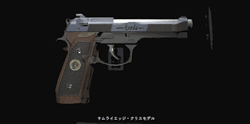 | 解説 | 9mm弾を15発装填できるハンドガン。制式採用の後、最高の精度と操作性を追求し、硬質スチール製のスライドとシルバーメッキのトリガーにカスタムされた。 |