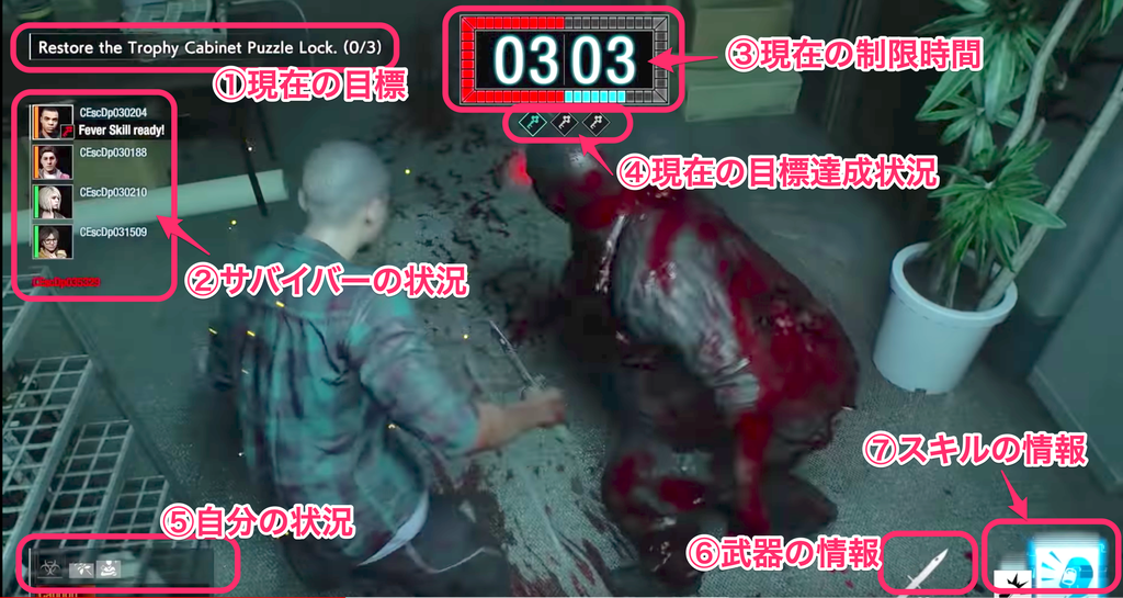 サバイバーの画面では、自分の状況や他サバイバーの状況の他、自分のスキル・武器の情報が見られる。現在の状況をよく判断し、制限時間に注意しながら攻略しよう。