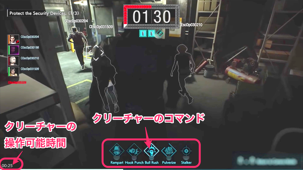 クリーチャー操作時(スレイブ化)には、操作しているクリーチャーの「操作可能時間」と「コマンド」が見られる。操作時間には限りがあるので、コマンドを駆使してサバイバーを追い詰めよう。