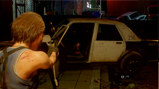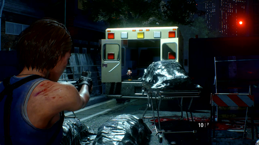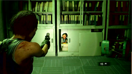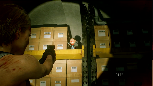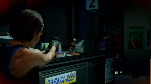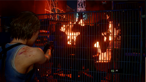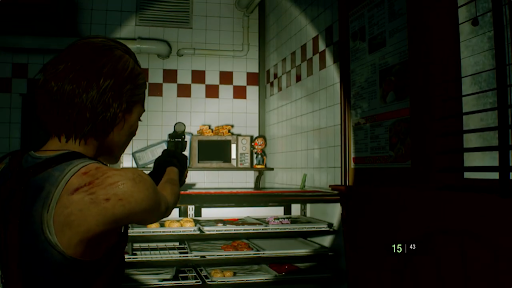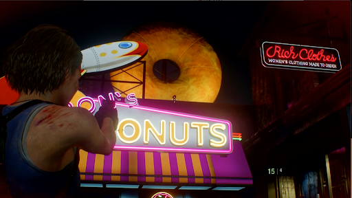 鉄道会社で消火ホースを入手後、ドーナツショップの大通り側入口を出るとネメシスが出現する。ネメシスは倒すことができないため、逃げ回りながら探索を進める必要があるが、一定ダメージを与えることで膝を着くダウンを取れる。