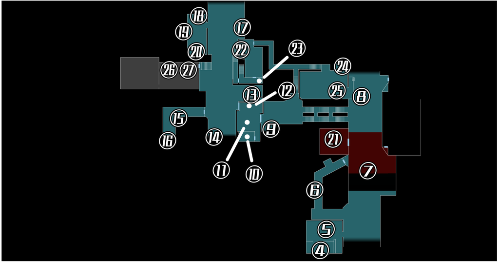 | 4 | T字路の左へ進み、突き当りの金庫のある部屋を探索する。 |