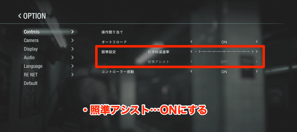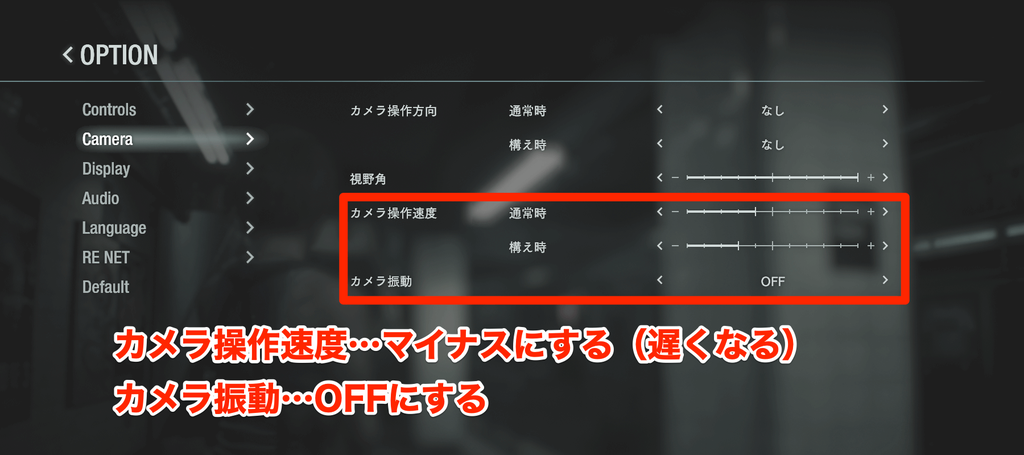また、「構え時のカメラ操作速度」を遅くすると、敵に照準を合わせやすくなる。カメラ醉い軽減の設定と合わせて一緒に調整しておこう。