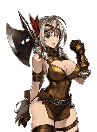 | 主人公の傭兵団の一員。生まれながらの戦士で、優れた実力と度胸を持っている。 ロより先に手が出るのが玉に瑕だが、その反面、理性的な性格を持ち、常識をわきまえている。 自身の村を助けてもらった事で、主人公に淡い想いを抱いているが、自らの気持ちを正直に伝えることができない。 アラン出身だが、他の地域出身のような自らの名前に不満を抱いている。 |