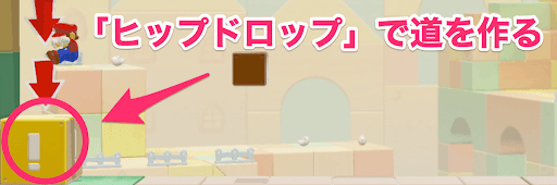 上地面に密着したビックリブロックに対しては、ヒップドロップがおすすめだ。ヒップドロップを使うと、ビックリブロックが一気に展開し、道が開ける。