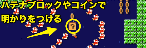 道中で「ハテナブロックを叩く」「コインを取る」と、エフェクトによって明かりが灯る仕組みだ。