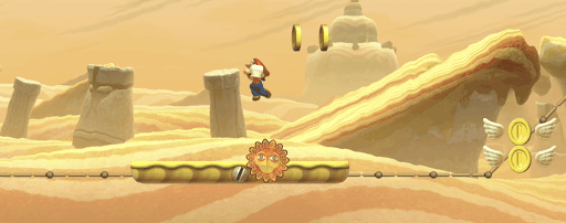 「さばくの太陽 あっちこっち」では常に地面が移動するので、タイミングを逃すと落下してしまう。クリボーも空から降ってくるので、太陽と合わせてジャンプをしたり飛んで回避しよう。