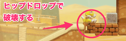 足元のレンガブロックは、ヒップドロップで破壊できる。ヒップドロップする際は、石材を床に置いておこう。