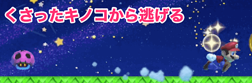 くさったキノコは触れるとダメージを受ける上、マリオを追いかけてくるため、常にダッシュして逃げよう。