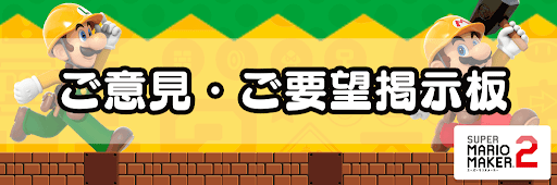 マリオメーカー2のご意見・ご要望掲示板です。マリオメーカー2攻略wikiに対してのご意見やご要望がある際に、ぜひご活用ください。