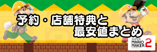 マリオメーカー2(スーパーマリオメーカー2)の予約購入特典と最安値について掲載。マリオメーカー2の製品情報をはじめ、早期購入特典、店舗特典、パッケージ版やダウンロード版の最安値も紹介しているので、マリオメーカー2を予約する際や購入する際の参考にしてほしい。