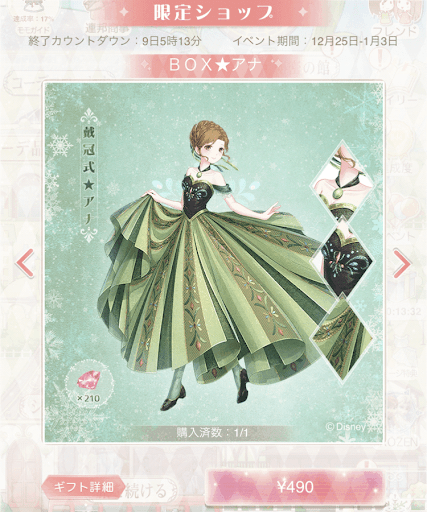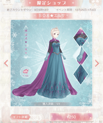 ディズニーコラボイベント第3弾の「アナと雪の女王」は、ガチャ形式のイベントだ。ガチャは1回100ダイヤを使用するが、初回だけ50%割引の50ダイヤで引ける。
