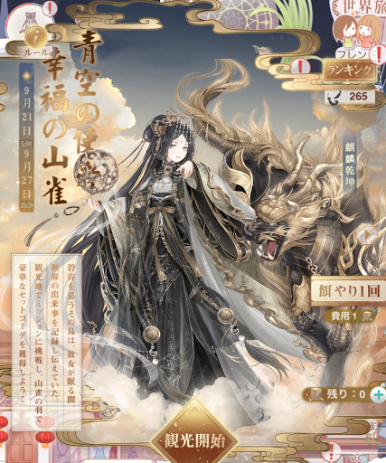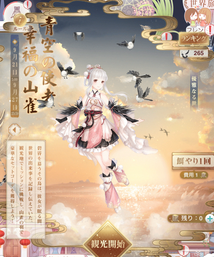 「青空の使者・幸福の山雀」は、世界旅行でミッションに挑戦する新しい形式のイベントだ。ミッションをクリアしないと限定セットコーデが入手できないので、初日からイベントに参加するのがおすすめだ。