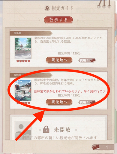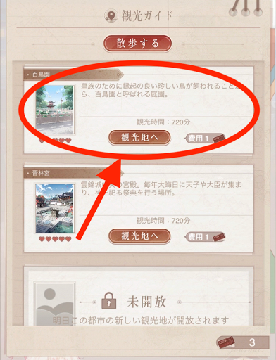「幸福の山雀・1」のストーリーを読んだら、観光直通券を使って「雲錦城-百鳥園」へ行く。しかし、12時間は移動できない仕様なので、早く進めたい方は「高速バス券」を24枚(120ダイヤ)使おう。
