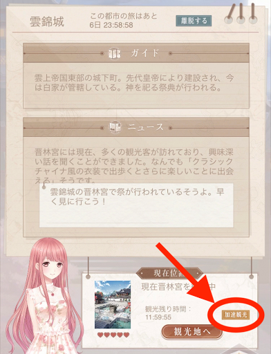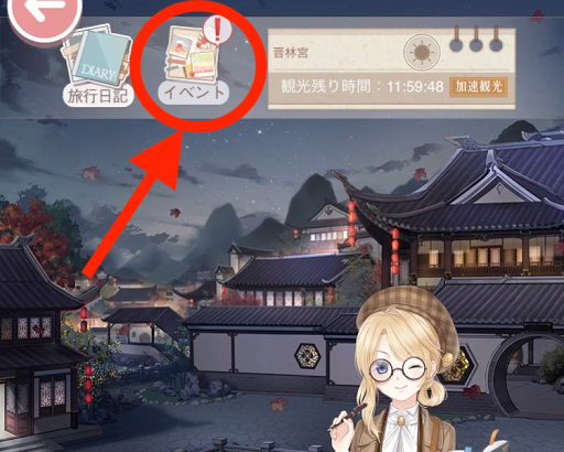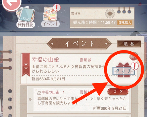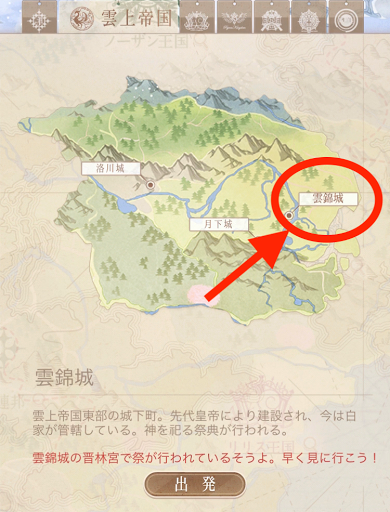 まずは世界旅行の画面を開き、観光直通券を使って「雲錦城-晋林宮」へ行こう。すると、イベント「幸福の山雀・1」のストーリーが発生するが、読むだけでOK。