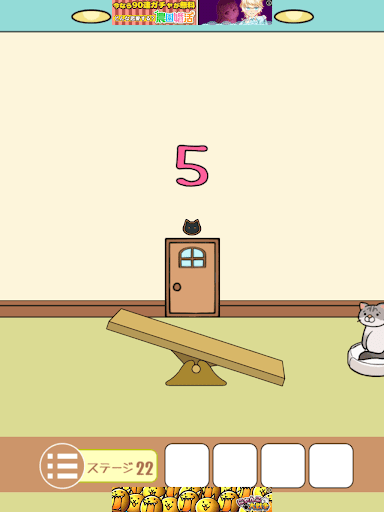 端末を傾けてシーソーの上に猫を移動させる。シーソーの上にいると壁のカウントが減っていく。