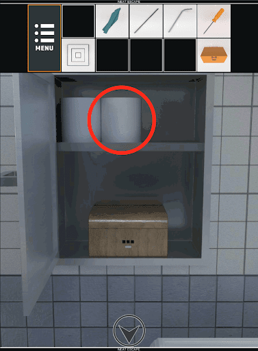 バスルームのドアの地点に移動し、画面右奥を拡大する。右下の段ボールを「カッター」を使用して開ける。