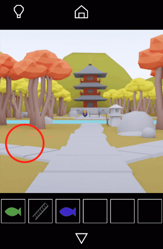 右側の灯篭を拡大する。魚の絵で確認した赤→青、青→赤、黄→緑をヒントに「緑色の魚」を灯篭の中に置く。