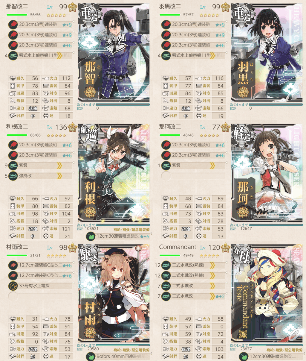 中の人はクリアするために妙高型4隻全員札を付けてしまったが、札を最適化した場合妙高型2隻でクリア編成が組める。今回は那智・羽黒の2隻を採用し、運の高い妙高は後段作戦に温存したほうが良い。