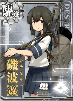 | 特型駆逐艦9番艦の磯波です。数々の作戦に参加したんですけど、中破してからは、後方で海上護衛や哨戒活動に従事していました。頑張ります。 |