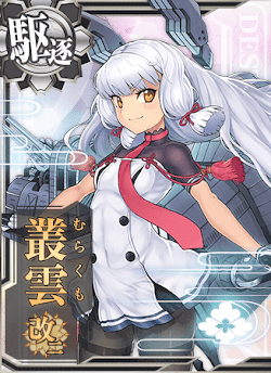 | 特型駆逐艦、5番艦の叢雲よ。え、知らないって? 全く、ありえないわね。南方作戦や、古鷹の救援、数々の作戦に参加した名艦の私を知らないって、あんた、もぐりでしょ! |