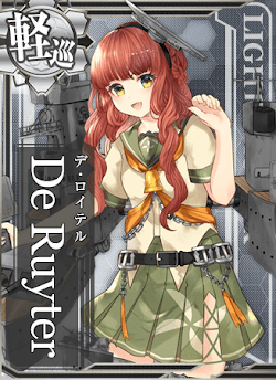 艦これ(艦隊これくしょん)のDe Ruyter(デ・ロイテル)の評価やステータス、おすすめ装備を紹介。De Ruyterのドロップ場所や運用方法、イラスト、声優(CV)も記載しているのでDe Ruyterを使う際の参考にどうぞ。