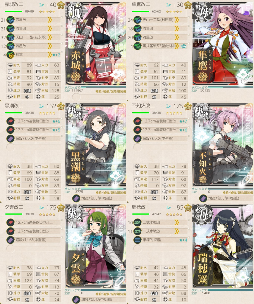ボス到達率アップ制空補助先制雷撃制空補助から先制雷撃まで幅広く活躍できる万能水母。全ての水母の長所を合わせた性能をしているので、所持していたら必ず編成したい。 |