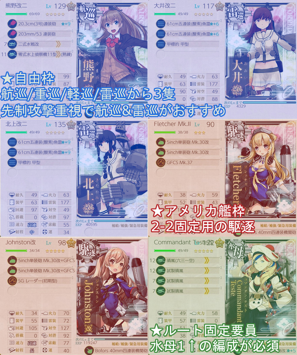 2-2は駆逐艦でルート固定をする場合、戦艦と空母の編成ができない。Gマスを経由してしまうので、重巡や雷巡などを中心に編成しよう。先制攻撃が強力な雷巡を編成するのがおすすめだ。