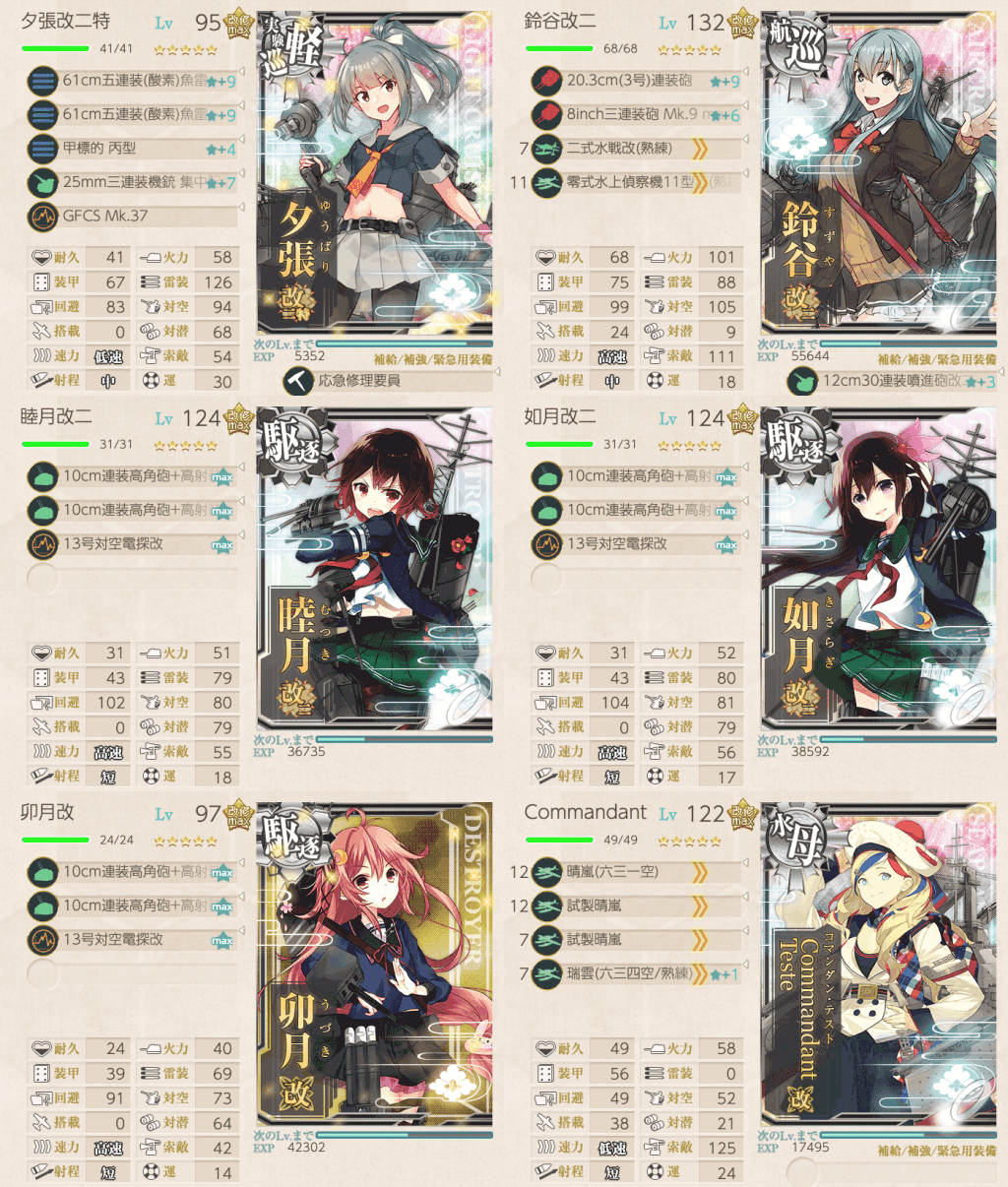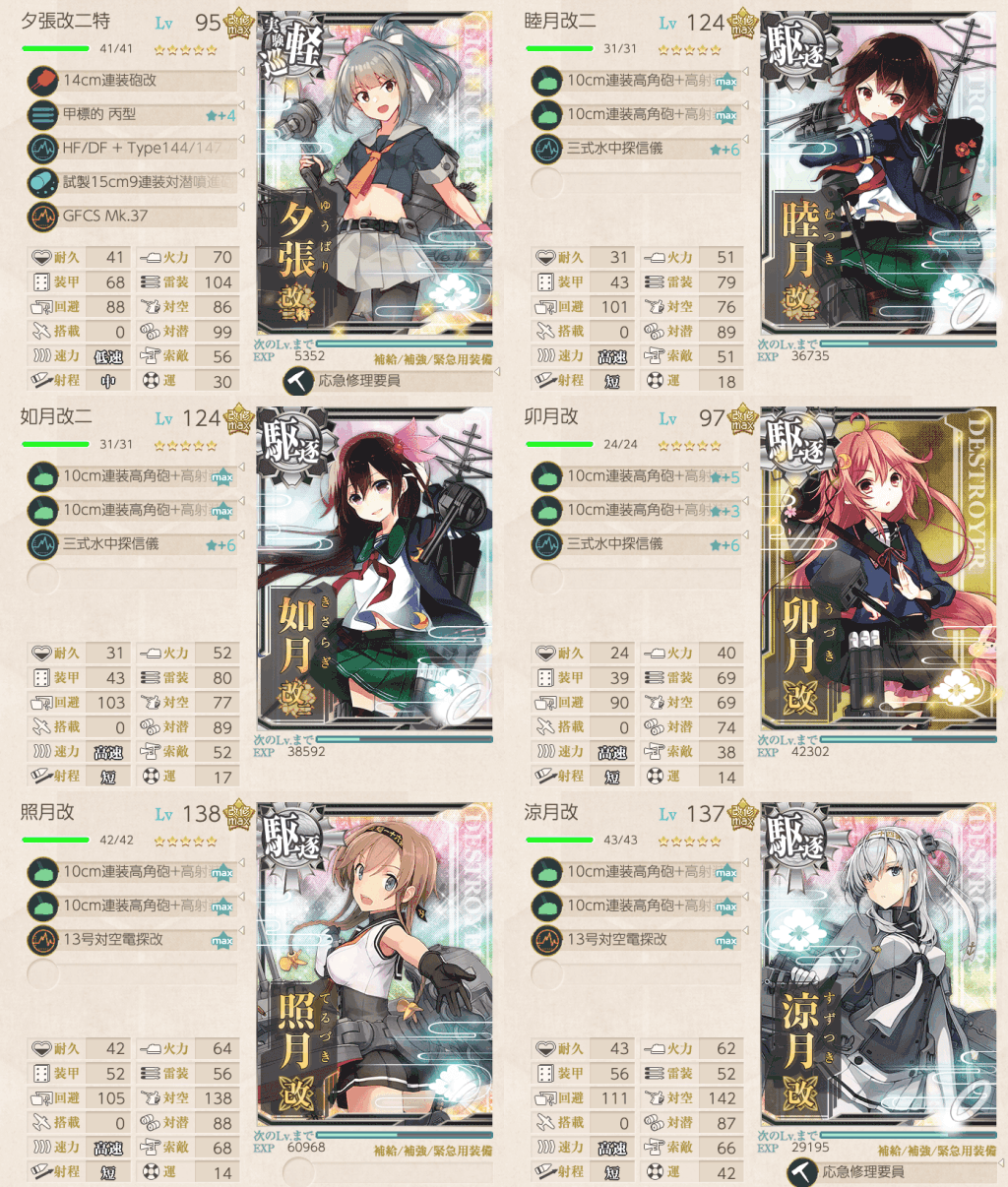 六水戦は睦月型駆逐艦で編成されているのも有り、基礎スペックが低めの艦娘が多い。その中でも改二が来ている睦月・如月や、対潜値が高い卯月を編成するのがおすすめだ。レベルや装備によるが、卯月はケッコンをしなくても先制対潜爆雷攻撃が可能だ。
