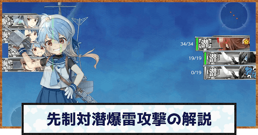 先制対潜爆雷攻撃とは、発動条件を満たした艦娘が敵の潜水艦に対して先制攻撃を行うことだ。先制対潜は敵潜水艦の先制雷撃より先に攻撃をするので、敵潜水艦の雷撃前に中破~轟沈を狙える。