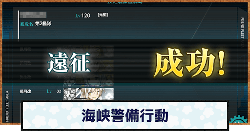 海峡警備行動は、通常の遠征とは異なった大成功条件が必要だ。旗艦のレベルが128以上だと4隻キラでも大成功100%が確定するので、旗艦には高レベルの駆逐艦を編成しよう。