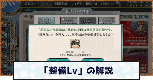 基地航空隊の整備Lvは各海域ごとの基地航空隊によって、個別に上げる必要がある。基地航空隊の入れ替え頻度や、疲労を早く回復したいと思う航空隊を優先的に上げるのがおすすめだ。