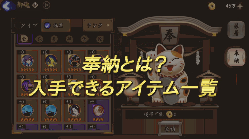 奉納とは、余った御魂を献上することで銭貨に交換することができる機能。