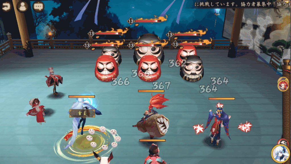 | 妖怪退治は毎日13時と20時の2回開催開催されるイベント。 妖怪退治で出現するダルマは、陰陽師のレベルに比例して上がっていくので非常に厄介。 妖怪退治の報酬で、式神挑戦券を入手できるので毎日必ず挑戦しよう! |
