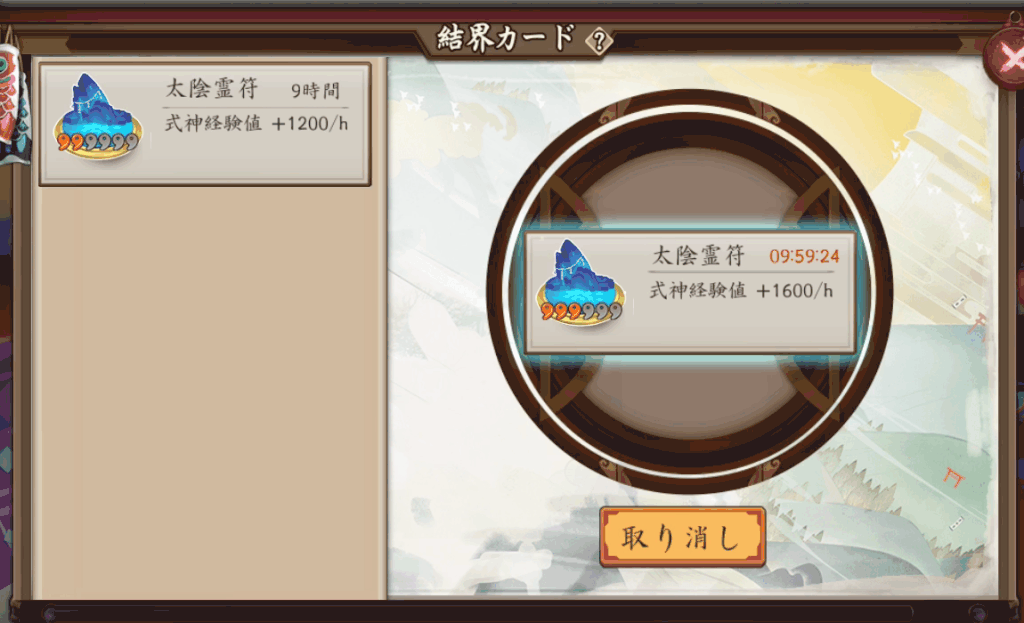 結界カードとは、陰陽寮で「式神育成」に配置された式神に経験値を与え育成することができるカード。