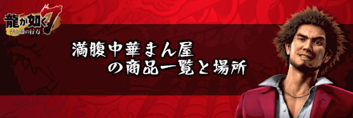 『龍が如く7』のショップ「満腹中華まん屋」で購入できる商品を一覧で紹介!満腹中華まん屋の場所もマップ画像で掲載しているため、龍が如く7を攻略する際の攻略の参考にどうぞ。