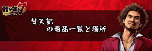『龍が如く7』のショップ「甘天記」で購入できる商品を一覧で紹介!甘天記の場所もマップ画像で掲載しているため、龍が如く7を攻略する際の攻略の参考にどうぞ。