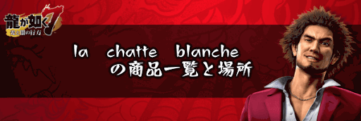 『龍が如く7』のショップ「la chatte blanche」で購入できる商品を一覧で紹介!la chatte blancheの場所もマップ画像で掲載しているため、龍が如く7を攻略する際の攻略の参考にどうぞ。