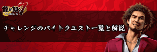 『龍が如く7』におけるチャレンジのバイトクエストを一覧にして掲載!チャレンジのバイトクエストの条件と上昇する人間力を一覧にして掲載しているため、龍が如く7を攻略する際の参考にどうぞ。